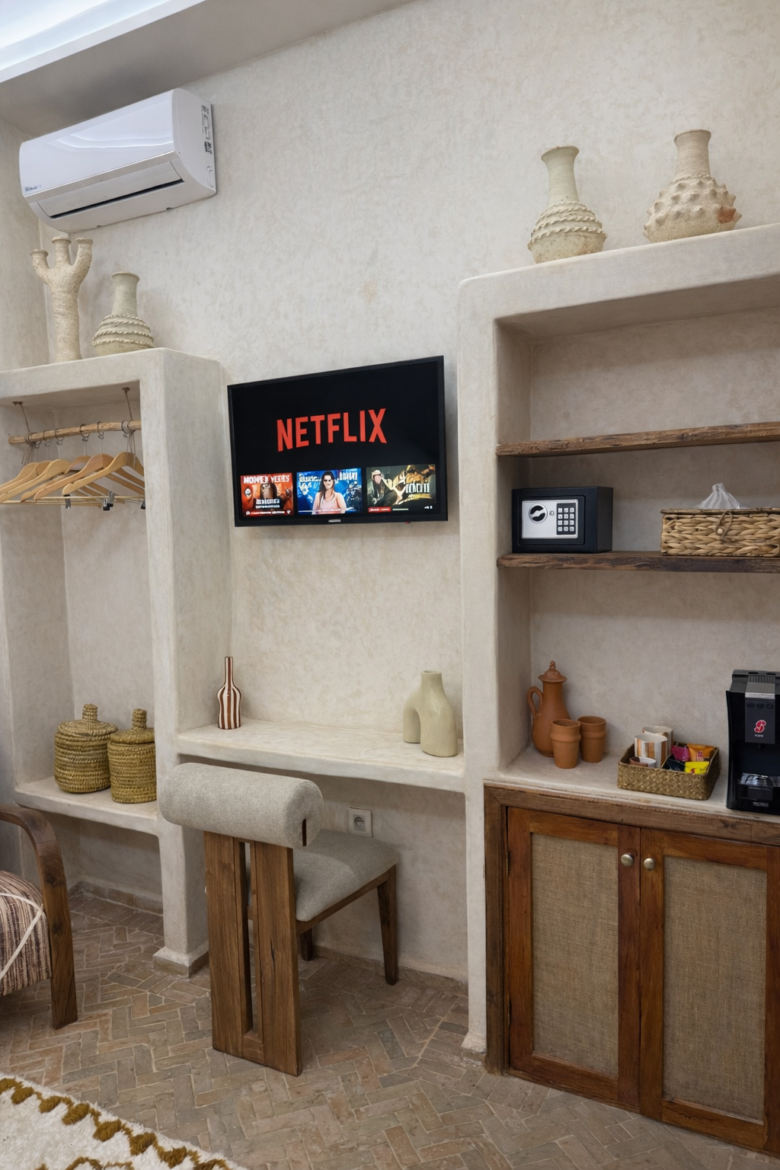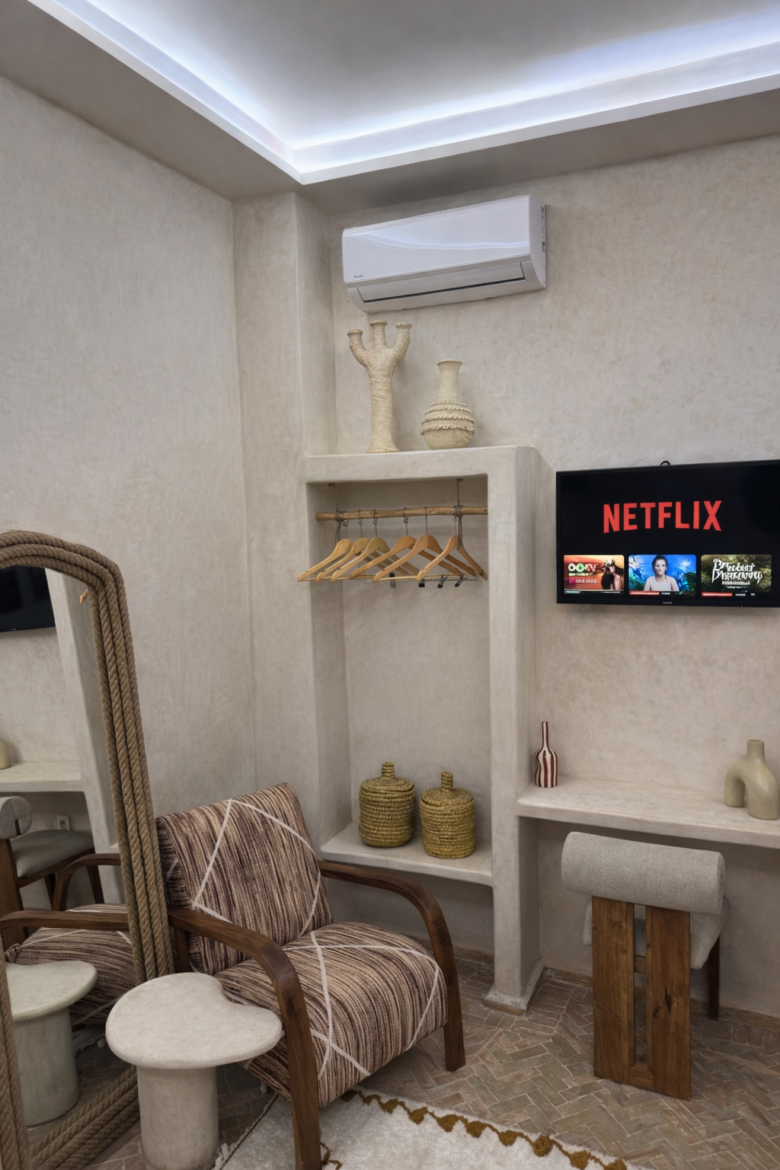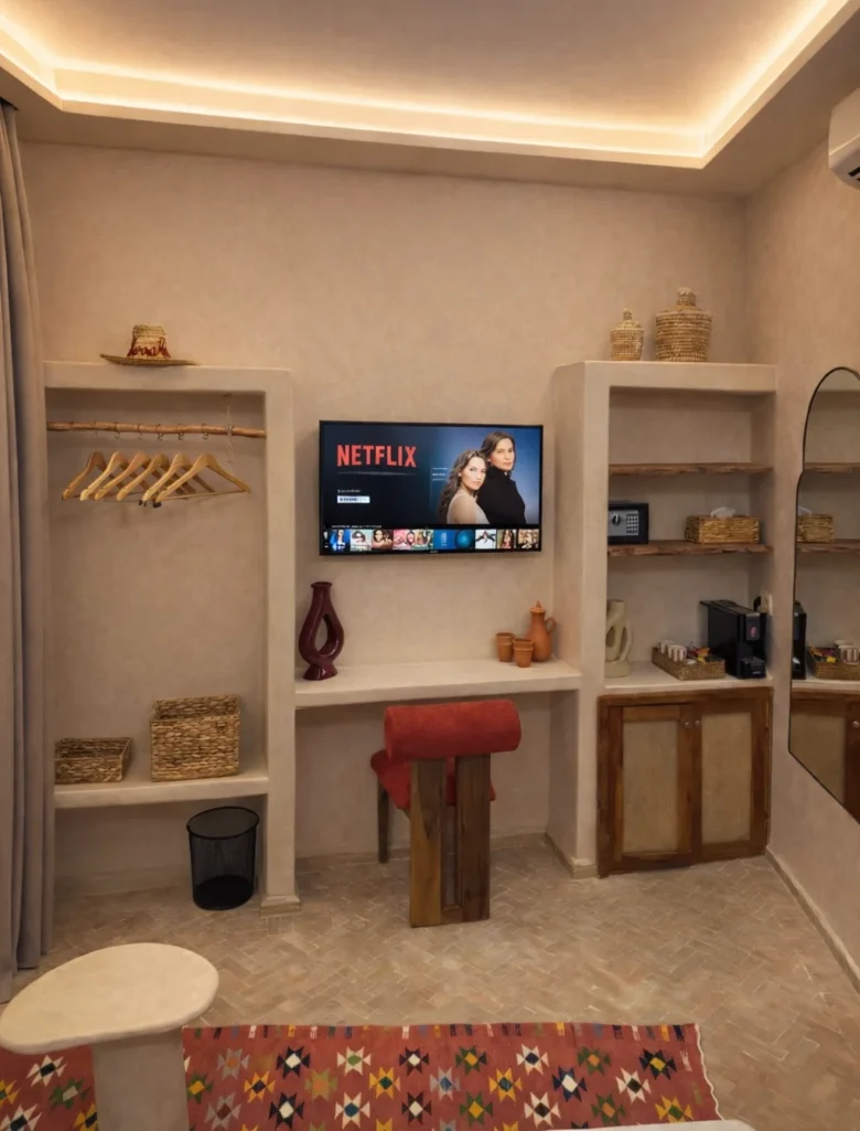 Chacune de nos six chambres rend hommage à une ville emblématique du Maroc — Marrakech, Fès, Chefchaouen, Essaouira, Ouarzazate et Dakhla. À travers les couleurs, les matières et les détails artisanaux, chaque espace raconte une histoire et invite au voyage.
