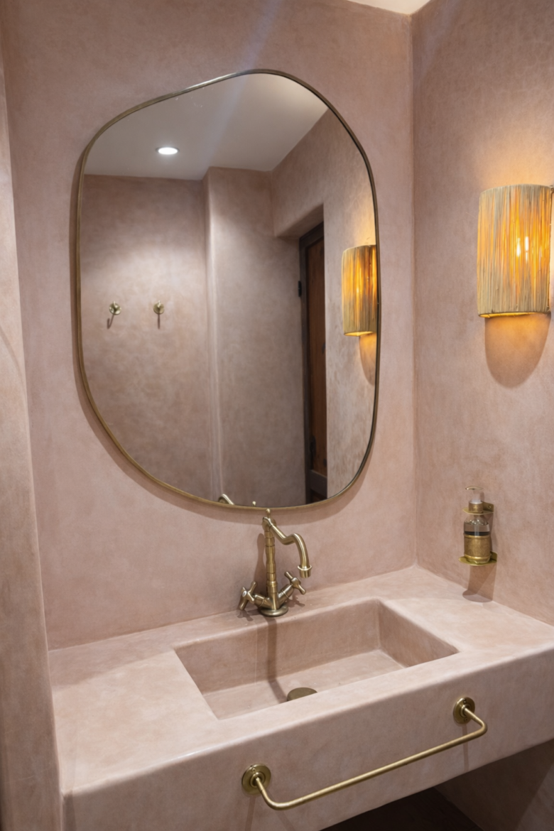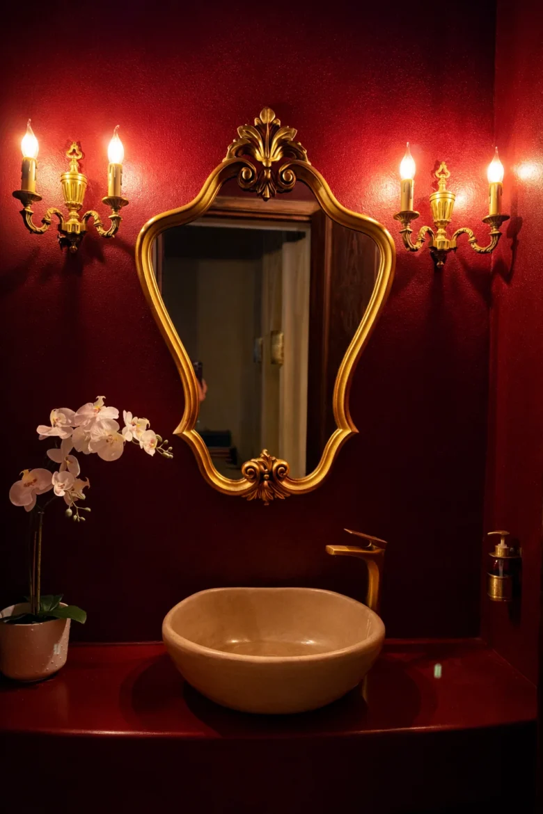 Dans une atmosphère chaleureuse aux murs rouge profond, cette salle de bain incarne l’élégance intemporelle du riad revisité. Le miroir doré sculpté, les appliques lumineuses façon bougies et le lavabo en pierre naturelle créent une ambiance à la fois théâtrale et sophistiquée.