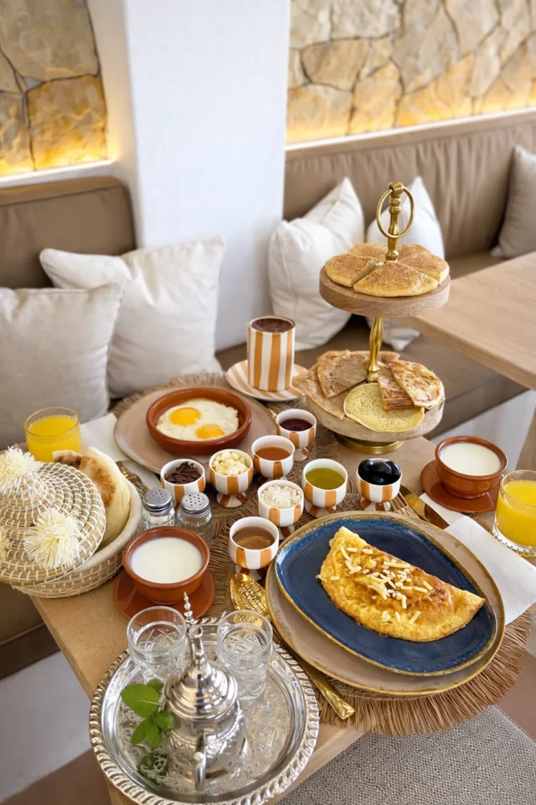 Chaque matin, Kasbay célèbre la générosité marocaine à travers un petit-déjeuner halal traditionnel servi à table. Pain chaud, msemen, harcha, amlou, miel, fromages, jus frais, œufs et spécialités locales composent une expérience gourmande et conviviale.