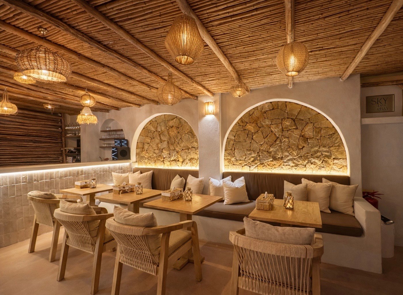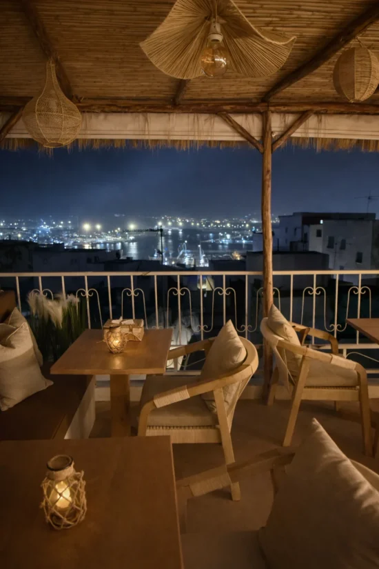 Perché au-dessus des toits de la médina, le rooftop Kasbay offre un moment suspendu entre ciel et mer. Dans une atmosphère douce et naturelle, entre bois, matières tressées et lumières chaleureuses, vous savourez le calme tout en restant au cœur de l’effervescence tangéroise.