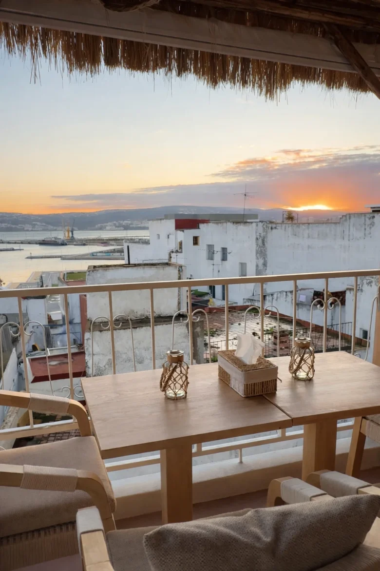 Baigné de lumière naturelle, notre rooftop offre une vue imprenable sur la mer et les toits blancs de Tanger. Sous sa pergola en bois naturel, dans une atmosphère douce et épurée, vous profitez d’un moment suspendu entre ciel et Méditerranée.