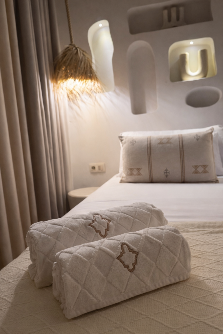 Chaque chambre de KASBAY rend hommage à une destination emblématique du Maroc, de la douceur bleutée de Chefchaouen aux horizons marins d’Essaouira. Six chambres, six destinations marocaines pensées comme de véritables refuges, elles mêlent artisanat marocain, matières naturelles et atmosphère apaisante